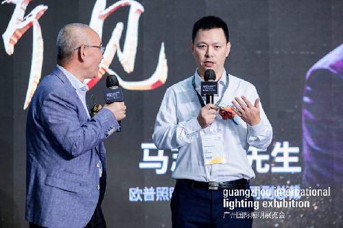 国家半导体照明工程研发及产业联盟副理事长唐国庆先生(左一)对话欧普照明副总裁马志伟先生(右一)